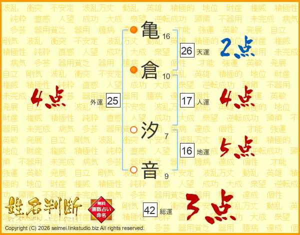 亀(16画)倉(10画) 汐(7画)音(9画)