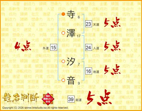 寺(6画)澤(17画) 汐(7画)音(9画)