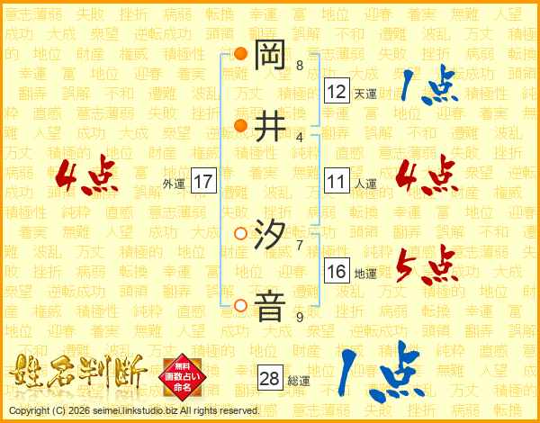 岡(8画)井(4画) 汐(7画)音(9画)
