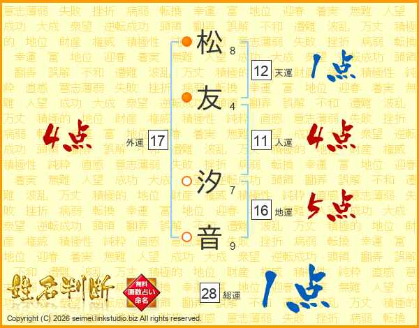 生活面を象徴する運勢です。外部から受ける影響力を表し、結婚運、家庭運や職場、環境への順応性を表します。総運から人運を引いた画数。姓や名が1文字の場合を除く。
