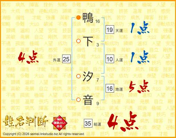 鴨(16画)下(3画) 汐(7画)音(9画)