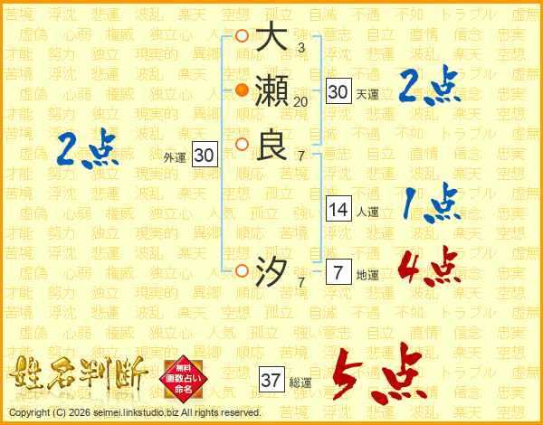 大(3画)瀬(20画)良(7画) 汐(7画)