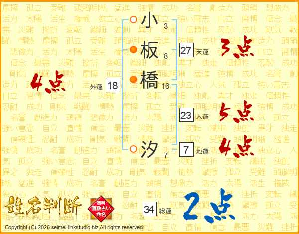 小板橋汐さんの総運は34画の2点!