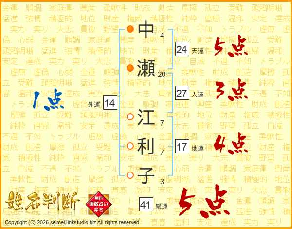 中(4画)瀬(20画) 江(7画)利(7画)子(3画)