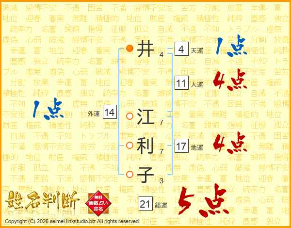 生活面を象徴する運勢です。外部から受ける影響力を表し、結婚運、家庭運や職場、環境への順応性を表します。総運から人運を引いた画数。姓や名が1文字の場合を除く。