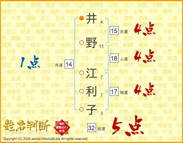 井(4画)野(11画) 江(7画)利(7画)子(3画)