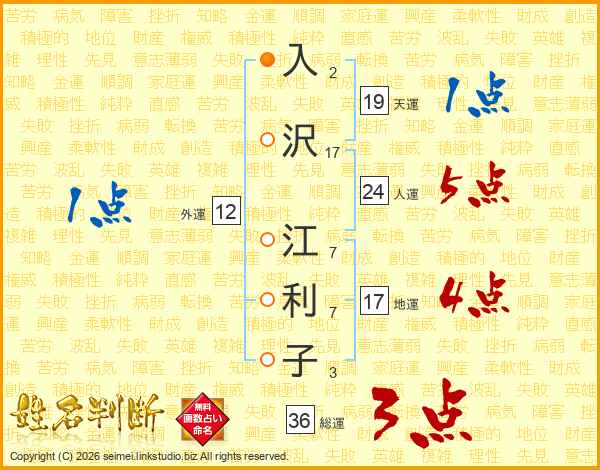 入(2画)沢(17画) 江(7画)利(7画)子(3画)