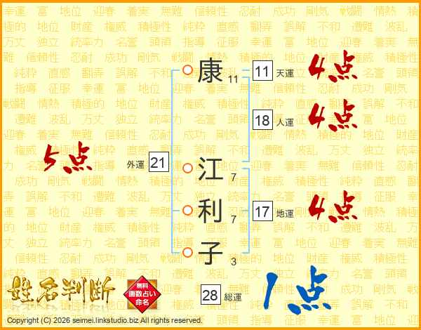 生活面を象徴する運勢です。外部から受ける影響力を表し、結婚運、家庭運や職場、環境への順応性を表します。総運から人運を引いた画数。姓や名が1文字の場合を除く。