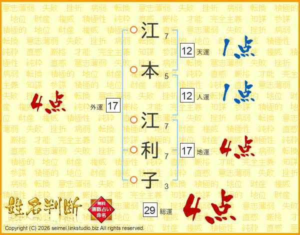 江(7画)本(5画) 江(7画)利(7画)子(3画)