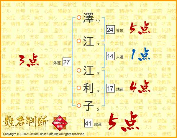 澤(17画)江(7画) 江(7画)利(7画)子(3画)