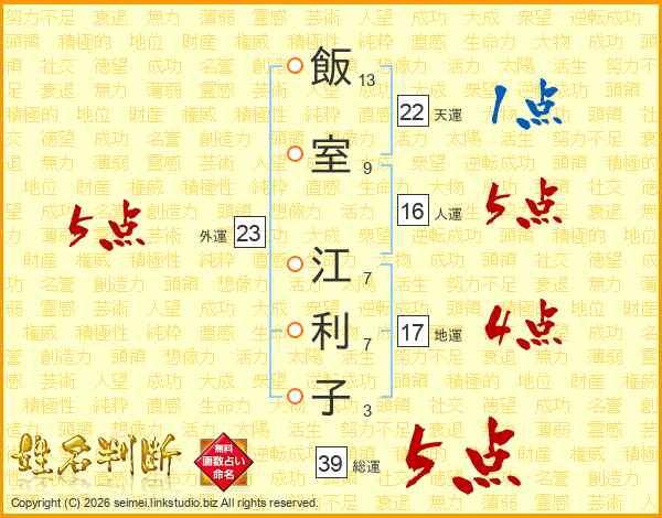 飯室江利子さんの総運は39画の5点!