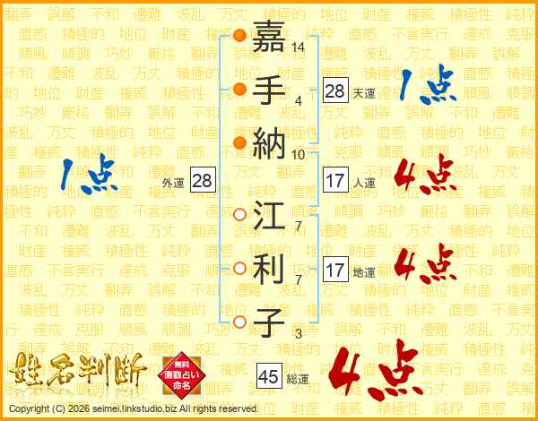嘉(14画)手(4画)納(10画) 江(7画)利(7画)子(3画)