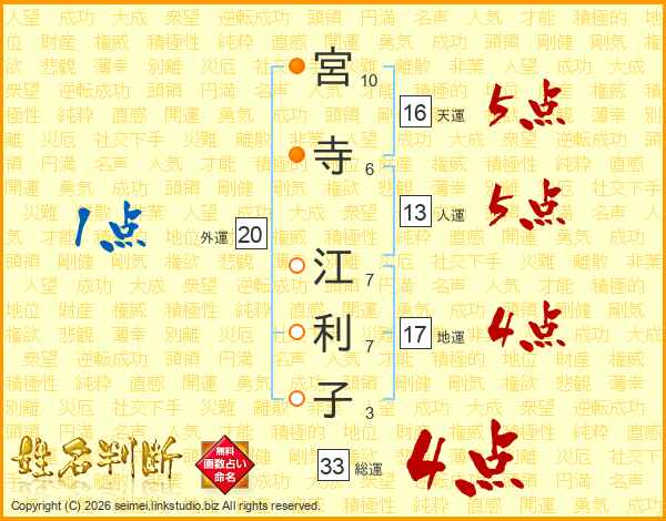宮(10画)寺(6画) 江(7画)利(7画)子(3画)