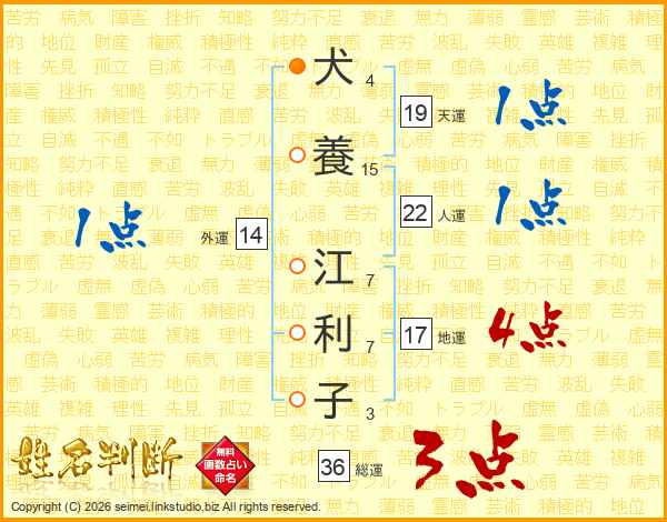 犬(4画)養(15画) 江(7画)利(7画)子(3画)