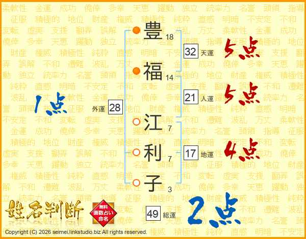豊(18画)福(14画) 江(7画)利(7画)子(3画)
