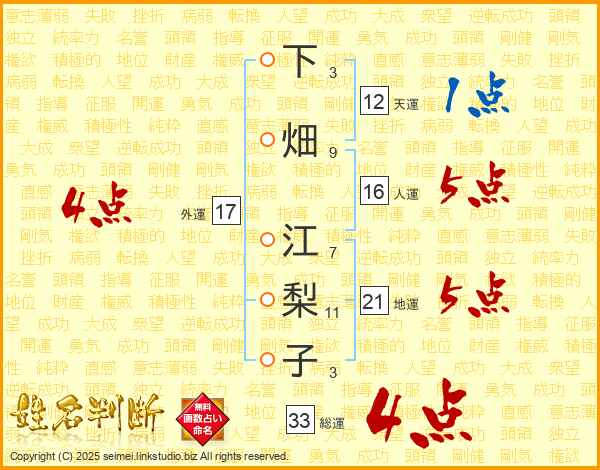 下(3画)畑(9画) 江(7画)梨(11画)子(3画)