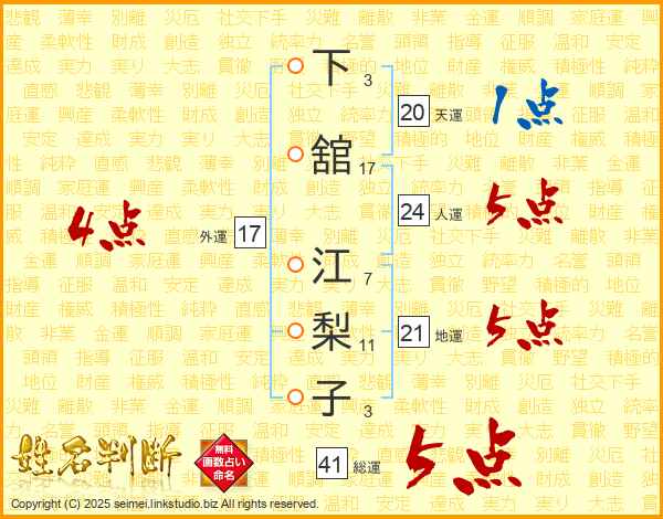 下舘江梨子さんの総運は41画の5点!