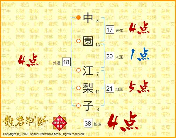 中(4画)園(13画) 江(7画)梨(11画)子(3画)