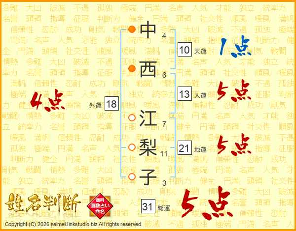 中(4画)西(6画) 江(7画)梨(11画)子(3画)