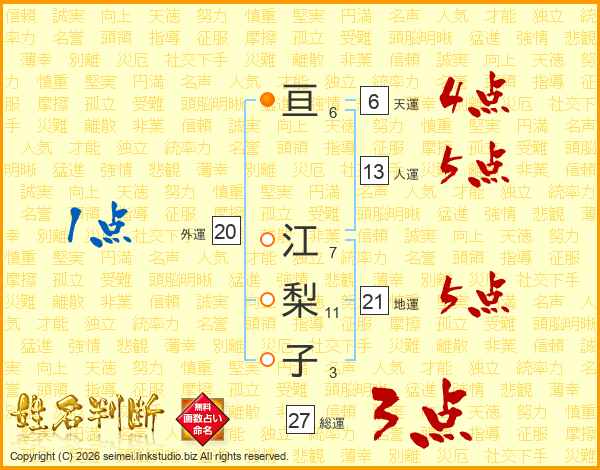 亘(6画) 江(7画)梨(11画)子(3画)