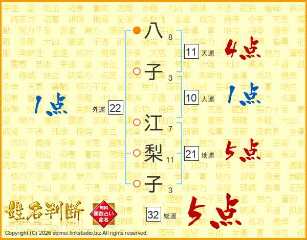八(8画)子(3画) 江(7画)梨(11画)子(3画)