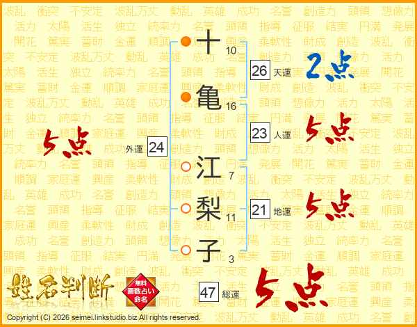 十(10画)亀(16画) 江(7画)梨(11画)子(3画)