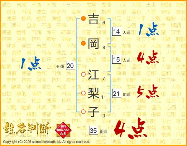 吉(6画)岡(8画) 江(7画)梨(11画)子(3画)