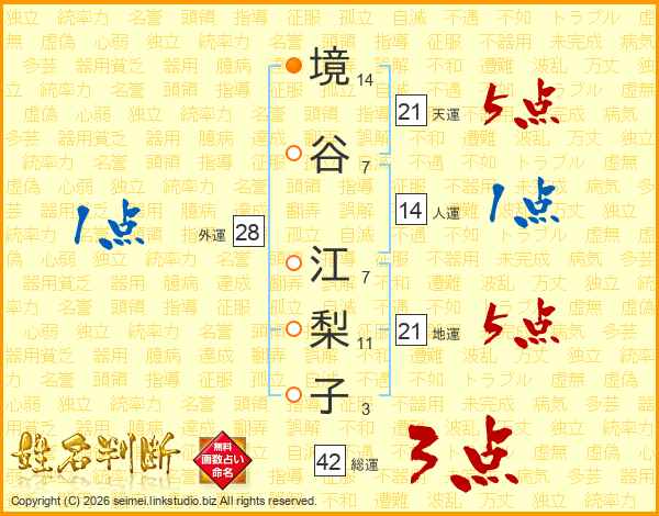 境(14画)谷(7画) 江(7画)梨(11画)子(3画)