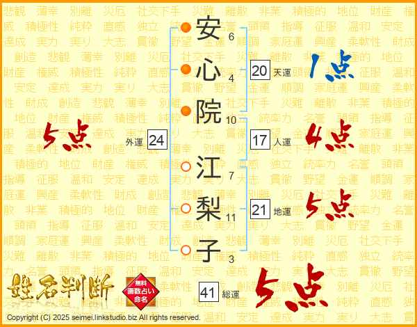 安(6画)心(4画)院(10画) 江(7画)梨(11画)子(3画)