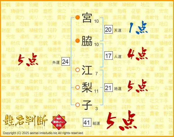 宮(10画)脇(10画) 江(7画)梨(11画)子(3画)