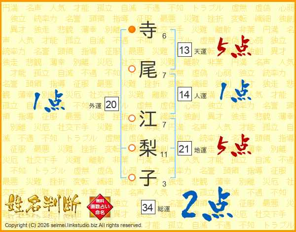 寺(6画)尾(7画) 江(7画)梨(11画)子(3画)