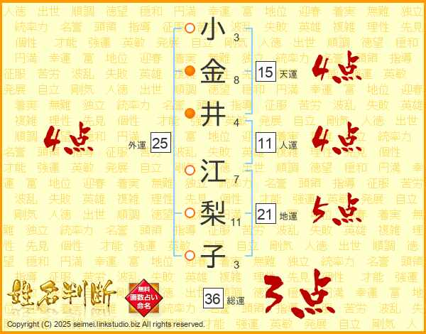 小(3画)金(8画)井(4画) 江(7画)梨(11画)子(3画)