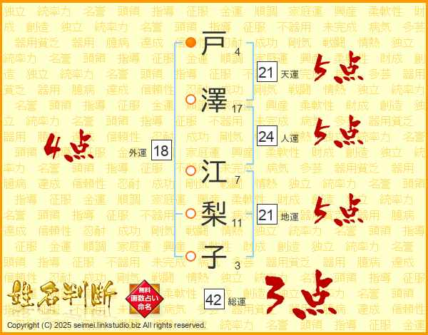 戸(4画)澤(17画) 江(7画)梨(11画)子(3画)