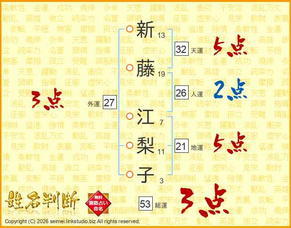 新(13画)藤(19画) 江(7画)梨(11画)子(3画)