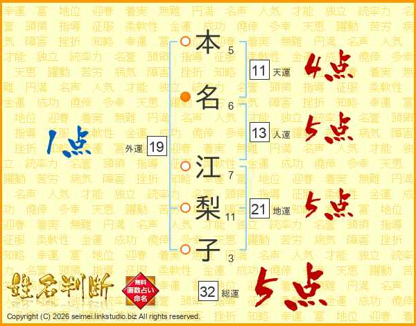 本(5画)名(6画) 江(7画)梨(11画)子(3画)