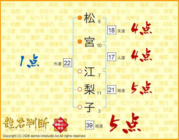 松宮江梨子さんの総運は39画の5点!