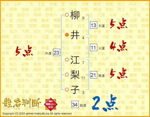 柳(9画)井(4画) 江(7画)梨(11画)子(3画)