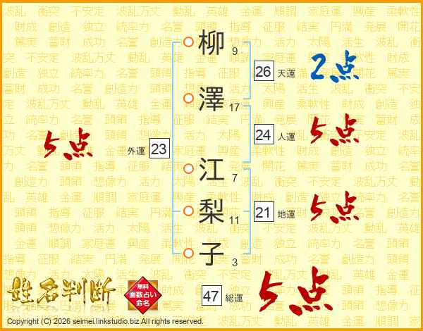 柳(9画)澤(17画) 江(7画)梨(11画)子(3画)