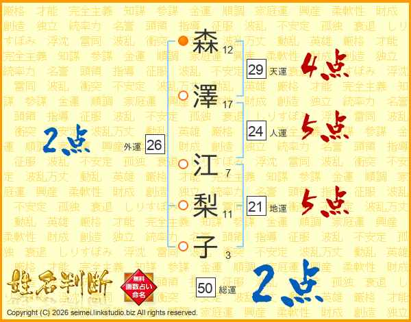森(12画)澤(17画) 江(7画)梨(11画)子(3画)