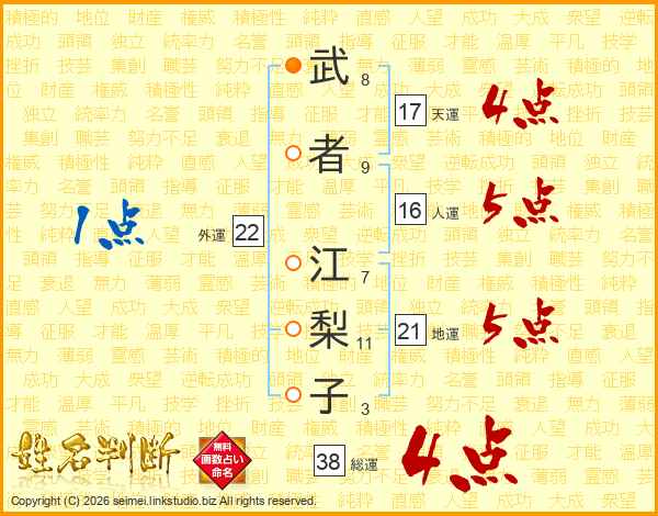 武(8画)者(9画) 江(7画)梨(11画)子(3画)
