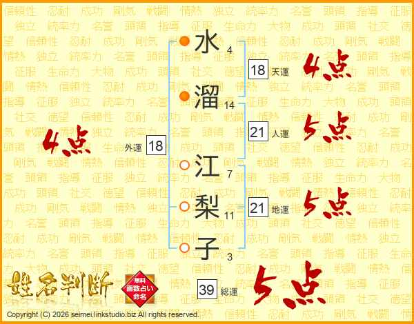 水(4画)溜(14画) 江(7画)梨(11画)子(3画)