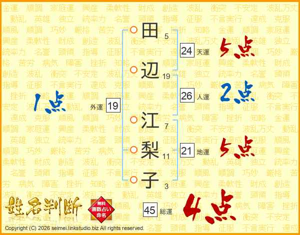 田(5画)辺(19画) 江(7画)梨(11画)子(3画)
