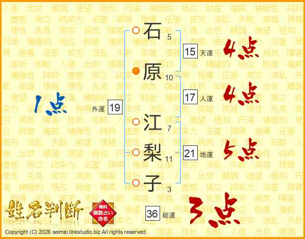 石(5画)原(10画) 江(7画)梨(11画)子(3画)