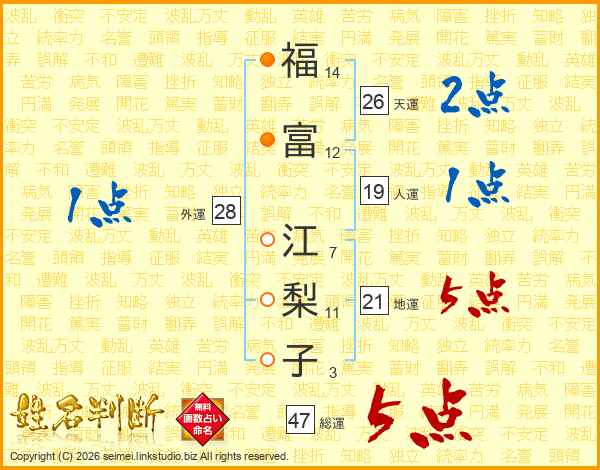 福(14画)富(12画) 江(7画)梨(11画)子(3画)