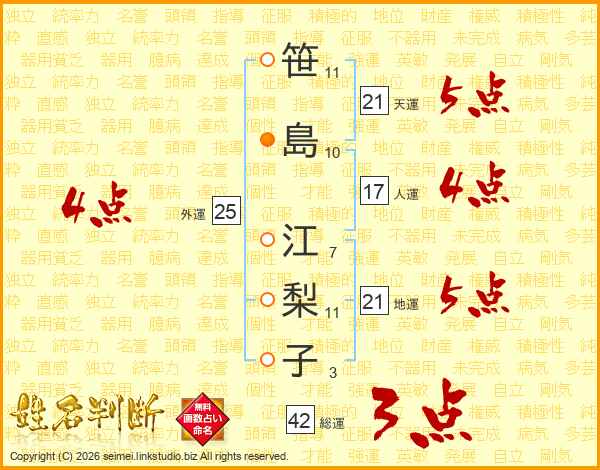 笹(11画)島(10画) 江(7画)梨(11画)子(3画)