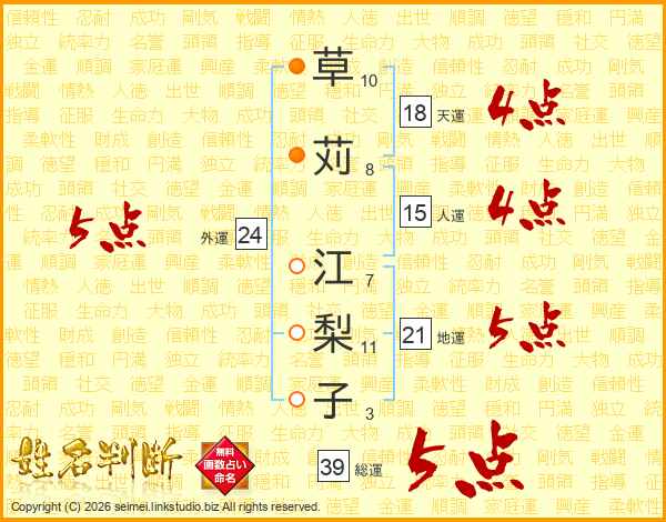 草(10画)苅(8画) 江(7画)梨(11画)子(3画)