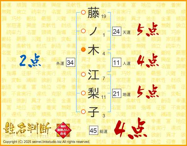 藤(19画)ノ(1画)木(4画)  江(7画)梨(11画)子(3画)