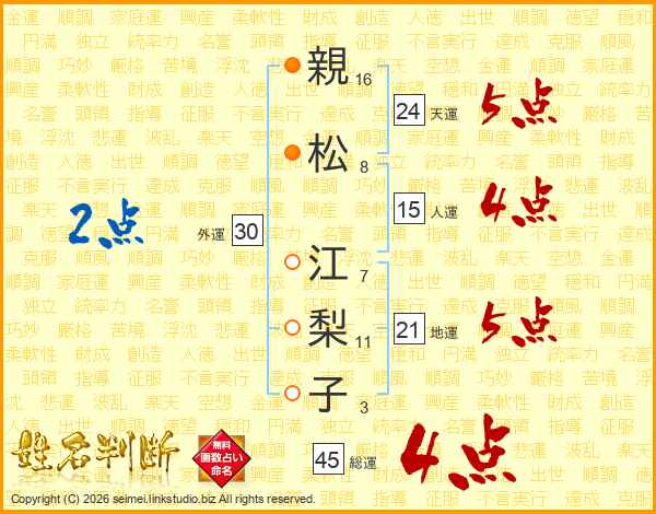 親(16画)松(8画) 江(7画)梨(11画)子(3画)