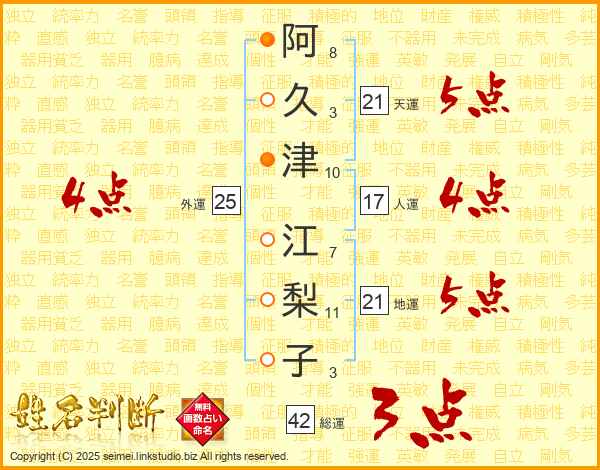 阿(8画)久(3画)津(10画) 江(7画)梨(11画)子(3画)