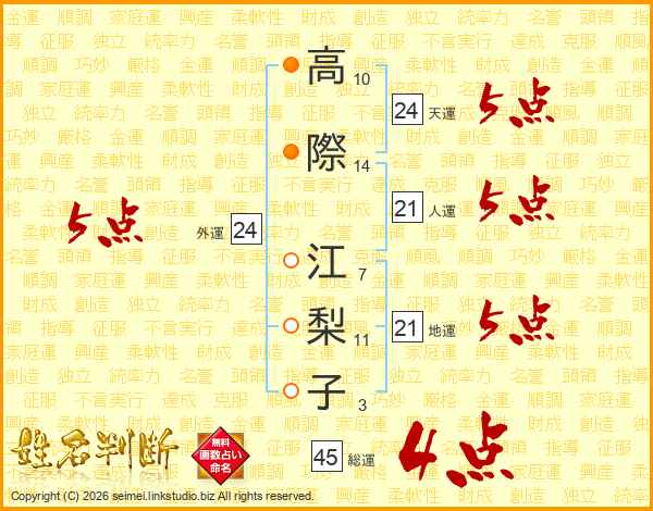 高(10画)際(14画) 江(7画)梨(11画)子(3画)